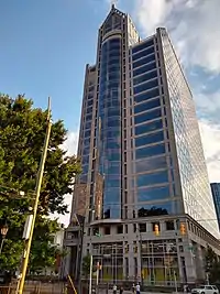 The Carillon Tower is a 394-foot-tall (120 m) high-rise in Charlotte, North Carolina, United States.[1] The building was completed in 1991 and it has 24 floors. The top of the high-rise contains a copper-roofed, Gothic central spire shaped like a bell tower, which rises 300 feet (91 m) from the base of the building. This structure is considered to be the most striking feature of the property, and it was designed to resemble the architecture of the historic First Presbyterian Church located across the street. The same church also inspired the building's name. An art gallery is located in the lobby of the building hosts a program of rotating exhibitions, including artist Jean Tinguely's Cascade, a 40-foot (12 m) mobile suspended above an indoor fountain. A landscaped public plaza is situated at the entrance of Carillon on West Trade Street. It surrounds a 30-foot (9 m) high multi-colored aluminum sculpture, designed by Jerry Peart, named The Garden. It has 470,726 square feet (43,732 m2) of Class A office space. This building was built on the former site of the Hotel Charlotte. In 2007, it was sold for $140 million (equivalent to $198 million in 2022[3]) to Hines.