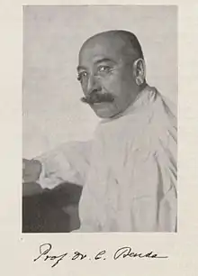 Carl Benda (30 December 1857 Berlin – 24 May 1932 Turin) was one of the first microbiologists to use a microscope in studying the internal structure of cells. In an 1898 experiment using crystal violet as a specific stain, Benda first became aware of the existence of hundreds of these tiny bodies in the cytoplasm of eukaryotic cells and assumed that they reinforced the cell structure. Because of their tendency to form long chains, he coined the name mitochondria ("thread granules").[1] These bodies had first been noted in 1857 by the physiologist and pioneer of the light microscope, Albert von Kölliker, and were later termed "bioblasts" by Richard Altmann in 1886.[2]