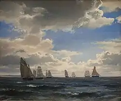 Sørensen attended the Danish Academy from 1843 to 1846. He took part in the decoration of the Thorvaldsen Museum in 1844. He studied perspective under Christoffer Wilhelm Eckersberg at the end of 1845. In 1846, he travelled to the Mediterranean, in 1853–54 he visited Germany, the Netherlands, Belgium, France and England. Almost every year he went on sea voyages. He took a special interest in the weather and its effects on the sea, developing his own recognizable style. He also painted more idyllic scenes, full of charm and atmosphere. His seascapes won him widespread popularity, especially those he painted under the First Schleswig War when he sailed with the Navy around Helgoland (1849) and in the Baltic (1850) where he depicted the Danish fleet in combat.[2][3]