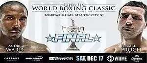 Andre Ward vs. Carl Froch was the Super Six World Boxing Classic Final championship fight for the WBC, WBA, & vacant The Ring super middleweight titles.[1][2] The bout was held on December 17, 2011, at the Boardwalk Hall in Atlantic City, New Jersey, United States. and was televised on Showtime.[3][4][5]