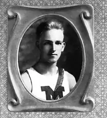 ![]() Carl Johnson, captain of the University of Michigan track team, 1921 | ||||||||||||