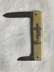 Carl Schlieper Stahlwarenfabrik & Export was originally a trading company started in 1754 or 1798 and was based in Remscheid Germany. Products included knives, tools and straight razors. Markets included the booming tobacco and rubber plantation industry in Siam (Thailand), Malaysia, British North Borneo[3] and the Dutch East Indies. A subsidiary of the company in Solingen dealt in knives including slipjoints, automatic knives, gardener, dagger, hunt measurer, machete, bowie, razors, and kitchen knives. Various brand names have been used and 22 patents held by the company. In the U.S. brand names have included "Fan", "Jim Bowie" and "El Gallo" and, after World War II, the "eye brand". In 1989 Schlieper merged with Remscheider. Carl Schlieper was liquidated in bankruptcy in 1993. Production of the brand was resumed by Freidrich Olbertz in Solingen.