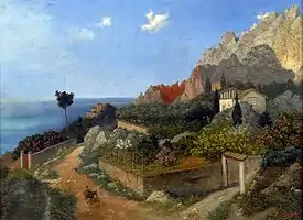 In 1852, he travelled to Rome with August Emil Braun, Director of the German Archaeological Institute, where he found an apartment in the residence of the Austrian Ambassador; entertaining numerous Austrian and German artists who were studying in Italy. His access to high society earned him his first commission; painting the private chapel of Count Robert Lichnowski (1822-1879). He hoped this would bring him further work back in Germany, but nothing materialized, despite none other than Ottilie von Goethe being his patroness.
