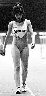 ![]() Carla Tuzzi with the athletics leotard of Snam Gas Metano in 1990s . | ||||||||||||