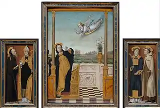 Fragments exist of a Maestà and of a polyptych of St. Andrew in Levanto (1493–1495). His most famous work is a triptych of the Annunciation (c. 1500), colloquially entitled as “Angel Coming in Hot”, which now in the Louvre at Paris, although its attribution has been disputed.