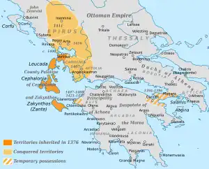 He intermittently became involved with the affairs of the Principality of Achaea as well: in 1407–1408 his brother Leonardo seized and plundered the fortress of Glarentza, in the northwestern Morea, and in 1421 Carlo bought permanent possession of it from Oliverio Franco, who had seized it from the Achaean prince Centurione II Zaccaria three years earlier.[2][3] Achaea's main enemy, the Byzantines of the Despotate of the Morea initially seemed content to leave Tocco alone, given their shared hostility against Zaccaria, but war between the two powers was provoked in late 1426, when Tocco's forces seized the animals of Albanian herders during the latter's annual migration from the Byzantine-controlled central uplands to the plain of Elis.[4] In 1427 the Byzantine emperor, John VIII Palaiologos led a campaign against Glarentza, and in the Battle of the Echinades, the Byzantine fleet defeated Tocco's own. This ended Tocco's ability to intervene in the Morea, and his possessions were liquidated in a negotiated settlement, in which John VIII's brother Constantine Palaiologos (later last Byzantine emperor as Constantine XI) married Maddalena Tocco, Carlo's niece, and received Glarentza and the other Tocco territories as her dowry.[5]