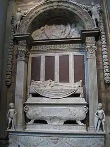 Marsuppini was born in Genoa into a family from Arezzo, but grew up and died in Florence. His father, Gregorio Marsuppini, had been governor of Genoa under Charles VI of France. Carlo was closely allied with the Medici family, and was a tutor to Lorenzo di Giovanni di Medici during the 1420s.[1] Circa 1433, he loitered in brief exile in Verona with Lorenzo and Cosimo di Medici.[2] In 1444, he followed Leonardo Bruni as chancellor of the Republic of Florence, with whom he shares the honor of a monument, designed by the sculptor Desiderio da Settignano, in the church of Santa Croce. Poggio Bracciolini became chancellor after Carlo's death.