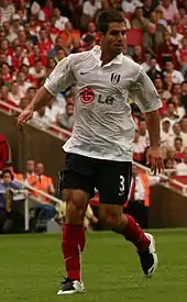 Bocanegra was signed by Fulham in January 2004, quickly becoming a fan favorite, garnering the nicknames the Jackal and the Black Snake.[6][7] With Fulham, Bocanegra played primarily as a center back, but also as a left back and briefly as a holding midfielder.[8] During the 2006–07 Premier League season, he was Fulham's second leading scorer with five goals, behind fellow American Brian McBride.[9] On September 1, 2007, Bocanegra captained Fulham for the first time in a Premier League match, a come from behind 3–3 draw with Tottenham Hotspur.[10][11] On September 15, 2007, he made his 100th appearance in the Premier League, all for Fulham, against Wigan Athletic.[12] He was released by Fulham on May 23, 2008.[13]