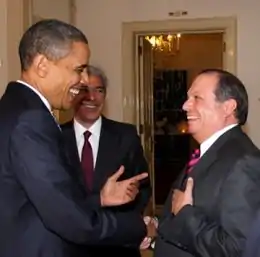 Barack Obama (left) meets Carlos César (right) during a visit to the Azores on November 19-20, 2010. In the background is the former Prime Minister of Portugal José Sócrates.