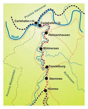 The Carl's railway branched off the main Kassel–Warburg line at the northern end of Hümme station. The 16.5 kilometre-long branch line was a single-track line in contrast to the main line. Its maximum grade was 1:100, its sharpest curve had a radius of 201 metres. The line ran above the right (eastern) bank of the Diemel on the western slope of the Reinhardswald. Its major structures were the 202 metre-long Deisel Tunnel between Trendelburg and Wülmersen that passed through the Kesselberg mountain, thus avoiding the Diemel valley flood plain, and a triple-arched viaduct over the Holzape, one of the streams that starts in the Reinhardswald. Stations were opened at Trendelburg (population of 1,014 at the opening of the line) and Helmarshausen (1,207) and Carlshafen (1,652 in the inner town). The line ran parallel to the Diemel through Karlshafen to the Weser port. The right-angled turn between the approach line and the Weser quay was overcome by two turntables.
