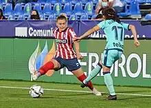 In the 2017–18 season, manager Ángel Villacampa converted Menayo from left-back to centre-back, accompanying Andrea Pereira in the axis of defense.[9] She played 26 of the 30 league games, in addition to making her Champions League debut on 4 October 2017 with a 0-3 defeat against Wolfsburg.[10] Atlético Madrid won the league title again that season and finished runner-up in the Copa de la Reina.[11][12]