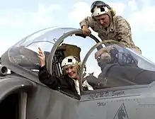 Judge Hansen visiting 76th Joint Civilian Orientation Conference, inside a Marine AV-8 Harrier aircraft aboard USS Iwo Jima, in Souda Bay, Greece, Sept. 21, 2008, on a seven-day trip through the European Command.