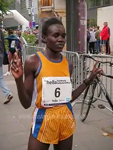 She won her first national title in 2005 and set an 800 m best of 2:03.6, but again did not have the standard for the major championship (the 2005 World Championships).[4] She competed at the 2006 Commonwealth Games but did not make it past the first round. It was that year that she first began to compete in European road races and she won the Spiridon Silvesterlauf, Basler Stadtlauf, Course de l'Escalade, Course du Noël and set a course record at La Corrida Bulloise.[5][6][7] She continued to mix road races and track running in 2007 and ran for Kenya in both the 800 m and the 1500 metres at the 2007 All-Africa Games.[8]