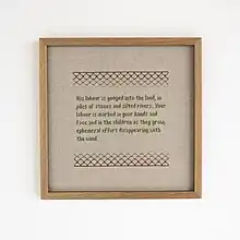 Her 2021 show The New Sun – her first in a dealer gallery – included linen samplers embroidered with the imagined words of pioneer women, complemented by colour photographs of the landscapes transformed by mining.[5]