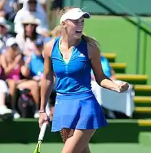 Wozniacki then took part in the first two Premier Mandatory tournaments of the year. At Indian Wells, she lost in the quarterfinals to eventual champion Vera Zvonareva.[30] In Miami, she scored her first win over Elena Dementieva, then lost to Svetlana Kuznetsova in the quarterfinals.
