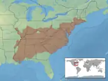 It is found in southern Connecticut, southwestern Massachusetts, southeastern New York, New Jersey, southeastern Pennsylvania, Delaware, Maryland, Virginia, eastern West Virginia, North Carolina, South Carolina, northern Georgia and Alabama, and in the Appalachian Mountains of Kentucky and Tennessee.[11]