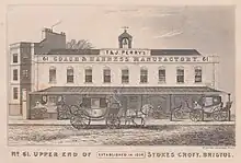 The Carriage Works was built in 1862 by Edward William Godwin from Pennant stone with Bath stone dressings. It replaced an earlier Coach & Harness Manufactory, owned by T&J. Perry's, established in 1804.[1] The new building has round arched arcades above double width segmental arches.[2] The ground-floor arches were originally open for access by John Perry and Sons' carriages.[3] In 1844 Thomas and John Perry paid £3 per year to rent the site. By the beginning of the 20th century Perry's had modernised from horse carriages to include the manufacture of cars at the site. From 1913 until 1960s the building was used to process rubber by the Anderson's Bristol Rubber Co. Ltd.[4] In the 1960 it was home to Regional Pools Promotions a membership scheme which gave prizes and raised money for charity, and later moved next door to Westmoreland House.[5][6]