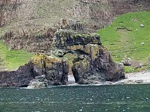 The first arch is visible at the end of the trek while descending from the ridge and looks as if it is opening into the sea and the second one is hidden. The openings created by wave action have been likened to cave entrances that "lead to another planet."[5] They are most easily approached during low tides.[6] Of the two arches seen below the cliff, one has been described as being like a railway tunnel "deep and dark" and the other rises high and overlain by debris which is conjectured as being of an earlier collapsed arch.[7] One of the formations is a pyramidal mass of rock, perforated through the middle by an unusually shaped arch (called the "keyhole"[1]), and surmounted by the solitary shaft of a basaltic pillar. Another arch ("tunnel") is massive, with columnar basalts appearing to hang from the top.[1]) It is 20 metres (66 ft) in height over a length of 43 metres (141 ft) with a width of 20 metres (66 ft). Wild goats, golden eagles, breeding fulmars, and kittiwakes frequent the area.[6]