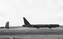 B-52 crews were sent through an intensive two-week course on the B-52D, making them eligible for duty in Southeast Asia. B-52s assigned to combat duty in Vietnam were painted in a modified camouflage scheme with the undersides, lower fuselage, and both sides of the vertical fin being painted in a glossy black. The USAF serial number was painted in black on the fin over a horizontal red stripe across the length of the fin.[10]