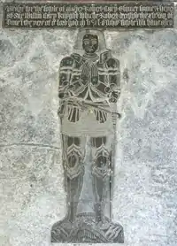 Sir Philip's son and heir, Sir William Cary (1437–1471), of Cockington, was beheaded after the defeat of the Lancastrians at the Battle of Tewkesbury in 1471.[13] He is believed to be represented by a monumental brass of a knight, without surviving identifying inscription, set into a slate ledger stone on the floor of the chancel of All Saints Church, Clovelly, next to a smaller brass, in similar style, of his son and heir Robert Cary (died 1540).[6] He married twice: