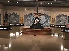 This gallery keeps the religious artworks. The monumental mid-18th century Indo-Portuguese pulpit, made of carved, multi-colored painted wood, is originally from the Church of Our Lady of Monte in Velha Goa, in India. The room also holds a set of display cabinets containing religious vestments, including an embroidered velvet antependium from 1592, pluvials and six silk brocade and lace chasubles from the 18th and 19th centuries. On the bottom of the room, there is a Portuguese 18th century carved and gilded wood altar piece surrounded by Portuguese silversmith artworks, carved Nottingham alabaster pieces and Flemish wood reliefs.
