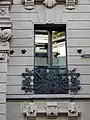The facade sports fanciful lintels, often dissociated from function. Along the roofline are leonine masks. The building is also notable for the wrought iron balustrades with complex swirling motifs. The four story apartment complex rises alongside the also Liberty-style Casa Ferrario and Casa Giovini, and facing the Casa dell'Unione Cooperativa.[1]