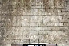 The tower's lateral facades is covered with masonry, simulating regular granite, with the upper third of the main and posterior facades in glass and ironworks.[1] The main facada, facing the east, is marked on its base by a rectangular, slightly-recessed curtain with a central door.[1] Above the wall is an inscription:[1]
