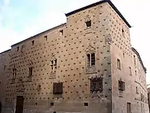 It was built from 1493 to 1517 by Rodrigo Arias de Maldonado, a knight of the Order of Santiago de Compostela and a professor in the University of Salamanca. Its most peculiar feature is the façade, mixing late Gothic and Plateresque style, decorated with more than 300 shells, symbol of the order of Santiago, as well as of the pilgrims performing the Way of St. James. In the façade are also the coat of arms of the Catholic Monarchs and four windows in Gothic style, each one having a different shape. The entrance portal has the coat of arms of the Maldonado family, while in the architrave are dolphins, a Renaissance symbol of love, and vegetable elements.