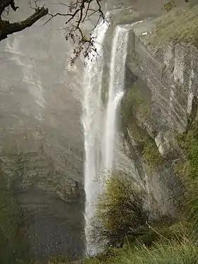 The Cascada de Gujuli (Basque: Goiuriko ur-jauzia) is a waterfall with a vertical drop of over 100 m (330 ft) near the village of Gujuli, in the municipality of Urkabustaiz, Álava province, Spain. The waterfall is found along the Arroyo Oiardo in Gorbea Natural Park, about 30 km northwest of Vitoria-Gasteiz on the road between Orduña and Murgia.