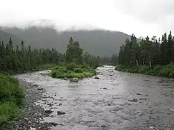The Cascapédia River is a river in the Gaspé Peninsula of Quebec, Canada, which has its source at Lake Cascapedia, fed by streams of the Chic-Choc Mountains, and empties into Cascapedia Bay (Baie de la Cascapédia), a small bay of Chaleur Bay. The river is about 120 kilometres (75 mi) long. At times, it is also called Grand Cascapédia River to differentiate it from the Little Cascapédia River which empties into the same bay just to the east.