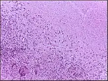 Caseous necrosis or caseous degeneration[1] (/ˈksiəs/)[2] is a unique form of cell death in which the tissue maintains a cheese-like appearance.[3] It is also a distinctive form of coagulative necrosis.[4] The dead tissue appears as a soft and white proteinaceous dead cell mass.