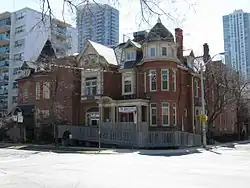 In 2000, the hospital acquired the 1875 William R. Johnston house that fronts onto Jarvis Street,[9] formerly nicknamed "the Grey Lady" by neighborhood residents due to its grey paint (now removed).[10] In 2015 renovation begun on the existing mansion, to restore its heritage features[6] and to add a large addition to the west. The 1889 coach house at the southwest corner of Huntley and Isabella Streets was demolished to make way for the addition.[11]