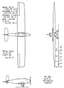 • Powerplant: 1 × ABC Scorpion air-cooled flat twin, 22 kW (30 hp) maximum, at 3,200 rpm