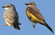 Cassin's kingbird and the western kingbird are similar in appearance. Cassin's is a little larger than the western and the upper parts are a darker gray than the western. The most distinctive difference between these birds is that the Cassin's has a thin white edge along the distal end of the tail feathers, while the western kingbird has a thin white edge that runs along the side of the tail feathers.[8] This difference can be seen in the adjacent image.