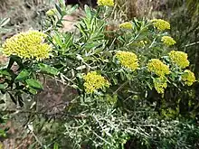 Cassinia telfordii is an erect shrub that typically grows to a height of 1.5–5 m (4 ft 11 in – 16 ft 5 in) with its young stems covered with cottony hairs, ageing to reddish-brown and glabrous. The leaves are linear, 30–85 mm (1.2–3.3 in) long and 1.5–4 mm (0.059–0.157 in) wide. The upper surface of the leaves is dark, glossy green, the edges are rolled down and the lower surface is paler green. The flower heads are 3–4 mm (0.12–0.16 in) long, each head with five or six yellow to cream coloured florets surrounded by ten to twelve overlapping involucral bracts in two or three whorls. Up to several hundred heads are arranged in each round-topped corymb. Flowering occurs from November to May and the achenes are 0.8 mm (0.031 in) long with a pappus of 16–25 bristles.[2]
