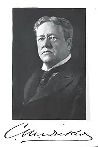 Wicker began his railroad career at twenty-one as a check clerk for the Star-Union Line in East St. Louis, moving up to cashier for the People's Dispatch, Chinese emigrant agent for the North Missouri Railway, and assistant general freight agent for the North Missouri Railway. In 1871 he became assistant general freight agent for the Chicago and North Western Railway, where he had the duty of settling the claims for the losses in the Great Chicago Fire of 1871.[4] In 1876 he moved to the Baltimore and Ohio Railroad as a general agent, assistant general freight agent, traffic manager for the Trans-Ohio division, mining manager in Northern Michigan, and general manager of the B&O's Illinois coal mines. In 1882 he became a commissioner for the Chicago Freight Bureau. In 1887 he was named vice-president of the Colorado Eastern Railway and in 1889 president of the Zanesville and Ohio River Railway. Concurrently he was also a vice-president of the Fort Worth and Rio Grande Railway, the Brooklyn, Queens County and Suburban Railroad, president of the Hudson Valley Railway, the Denver Railroad, Land and Coal Company, the Dillon-Griswold Wire Company, and president of North Shore Traction Company (which owned the Lynn and Boston Railway and controlling stocks in many others).[1][3]