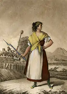 In addition to this crucial work, while operating near the Puerta del Carmen, she found herself in grave danger. Suddenly surrounded by French cavalry, rather than fleeing, she picked up a discarded musket and started firing.[4] The French, surprised by the fierceness of this Spanish peasant and her skill with the weapon, retreated.[5] Her actions inspired the defending troops and the French forces were repulsed.[2] She subsequently also participated in the second siege of Zaragoza and once again her personality, as well as her military prowess, inspired the people of Zaragoza, who considered her a hero.[6][note 2]