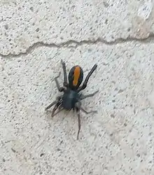 Castianeira crocata is a species of true spider in the family Corinnidae, sometimes called by the common name red stripe spider.[1] It is found in the United States.[2][3][4][5] Though its body shape is quite different, its characteristic black body and red-marked back puts it at risk of being mistaken for a black widow spider.[1]