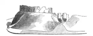The castle was strategically located where the River Nar met the Peddars Way, an old Roman road, at the centre of Warenne's other estates in Norfolk, and may have been built on top of Toki's former house.[6][lower-alpha 1] The castle had a motte-and-bailey design: its large outer and inner baileys were protected by earthworks and palisades, and a stone gatehouse was added to the inner bailey shortly afterwards.[8] In the centre of the inner bailey was a grand double-hall built from stone, but this was not fortified and would have been more like a country house than a conventional Norman keep.[9][lower-alpha 2]