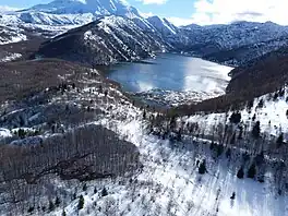 The lake filled rapidly during the winter of 1980–1981, and was expected to overflow the blockage in the fall of 1982.[3] However, a subsequent study predicted an earlier overflow, so in October 1981 a spillway 270 meters (890 ft) long and 30 meters (98 ft) wide was constructed to prevent the lake from flowing over the blockage, while at the same time the lake was cleared of the numerous downed trees that were blown into the lake by the eruption explosion.[3][5] In 1991, rainbow trout appeared in the lake, apparently resulting from the migration of stock introduced to Coldwater Lake a few years earlier.[2][4] The trout of Castle Lake are a self-perpetuating population, successfully spawning in the streams that feed Castle Lake.[4]
