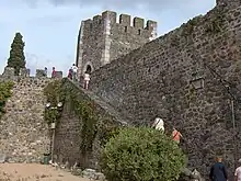 The castle is the principal nucleus of a group of fortifications that encompass the medieval city, implanted in its northwest corner. It is an irregular pentagonal plan, with a partially-encircled irregular barbican to the north and southern line.[1] The two lines of walls are lined with parallel merlons over embrasures, internally encircled by adarves and reinforced by corbels and towers, protected by battlements towers. The exception is the eastern tower, an irregular pentagon, addorsed externally on the castle angle, and two semi-circular corbel, that reinforces the southeast barbican with gates.[1]