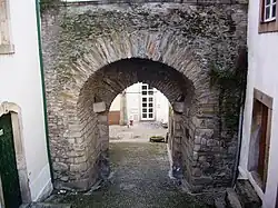 Of the remaining links to the castle's history, is the Santo António Gate, formed from two thick walls, separated by a rounded arch, broken on the exterior and rounded on the interior side.[1][2] The gate is approximately 4.5–5 metres (15–16 ft) high, with the still visible the grooves in the granite stones for the hinges used in opening and closing the access.[1] Over the gate are vestiges of the primitive Chemin de ronde walkway, which was later transformed into a terrace for the residences.[1] There are other wall segments throughout the city, some 5 metres (16 ft) high and 2 metres (6.6 ft) thick, built with a base of granite and shale throughout.[1]