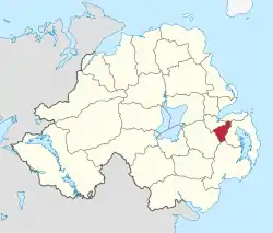 The district was one of twenty-six created on 1 October 1973. It was formed by the amalgamation of the following areas of County Down: most of Castlereagh Rural District, the Carryduff and Newtownbreda areas of Hillsborough Rural District and the Moneyreagh area of North Down Rural District.[2][3]