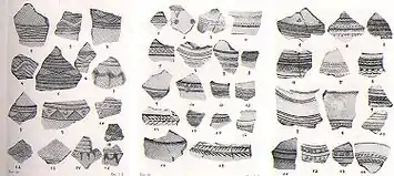 The decorative themes on the pottery are fairly uniform. Common designs are of parallel vertical and horizontal lines, triangles, stars, S-shaped patterns, and fish-spine designs. Also common were interlaced designs, impressions using ropes or "mamelóns", as well as other varied ornamental designs. The major part of the ceramics were plain and undesigned, however.