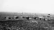 By May 1920, production from one well, drilled to a depth of 660 feet (200 m), had totaled up to 200 barrels a day.[10][18][N 6] In April 1921, 30 producing wells owned by six different companies, were at work.[32] In a "raw, roaring oil camp",[11] as many as 300 men lived in the area in tar paper shacks for families, with company bunkhouses for single men, a company cook house and a recreation hall.[29] In the town that sprang up, only a post office, church, school and cemetery provided services.[33] A post office was established in Cat Creek in 1922, remaining active until 1996.[34][N 7]