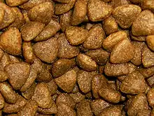Dry food (8–10% moisture) is generally made by extrusion cooking under high heat and pressure. Approximately 95% of dry pet foods are extruded.[23] During the extrusion cooking process, the meat is first ground up then it is cooked under very high heat and processed so it becomes a powder. The powder is fed into a massive mixer. Once it's in this massive mixer, additional supplements are added; then it's then cooked again under a very high heat to turn it into a dough. The dough is formed so that it can be molded into the form of kibble. The kibble is placed again in high heat to be baked in order to make it stay in that shape. Once the piece comes out, it doesn't smell like meat. Fat may be sprayed[24] on the food after the extrusion cooking process to increase palatability, and other minor ingredients, such as heat-sensitive vitamins, which would be destroyed in the extrusion process, may be added.[25] Dry food is most often packed in multi-wall paper bags, sometimes with a plastic film layer; similar bag styles with film laminates or coextrusions are also used.