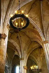 In the interior, all aisles are of approximately equal height, resembling a hall church. The stone rib vaulting is supported by massive pillars and was built between 1505 and 1513, being an outstanding example of Manueline architecture. Some ribs of the roof (liernes) are shaped like twisted ropes and knots, typical Manueline decorative motifs.