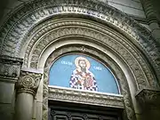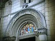 Church, characterized as a combination in Serbian-Byzantine style of Moravian and Rascian richly decorative and ornateness, The same symmetry applies to the exterior and interior of to the Serbian Orthodox Gračanica Monastery in the South province of Kosovo and Metohija, Serbia. Its thus dominated by five domes, one more slender in the center and four other smaller ones in the corners of the building,[2] the portal is richly decorated, elevated with five domes and the least present Raska elements, in portal shape.[2]