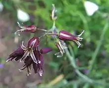 Each flower is showy, with a magenta to purple hollow urn-shaped body and a mouth surrounded by contrasting white petals which curl outward. The fruit is a silique several centimeters long containing winged seeds.