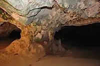 The Fontein Cave is a small cave near Boca Prins on the northern part of the island. It is well known for its native Arawak drawings on the wall, which were decoratively etched by Amerindians on the stones walls and flatter roof portion of the cave in brownish-red colour or reddish brown or purplish colour; this in turn gives a clue to the history of the Amerindians. The cave is accessible from an "escarpment of a terrace of coral limestone" and has a width of 3 metres (9.8 ft) and a height of 2 metres (6 ft 7 in). The entrance hall, which is open for visitors, is 4 metres (13 ft) in height and extends to a depth of 50 metres (160 ft). As it is in limestone geological formation, solution effect due to seeping water has resulted in colourful stalagmites and stalactites formations in very odd shapes and sizes. Long tongued bats nestle in the holes of the cave which go on their nocturnal hunt to collect and feed on food in the form of nectar and pollen.[1][2][7] It is also reported that Arawak Indians used to perform their tribal rituals and ceremonies inside this cave.[2]